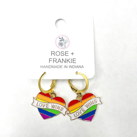 Rainbow charm on hypoallergenic gold huggie hoops.