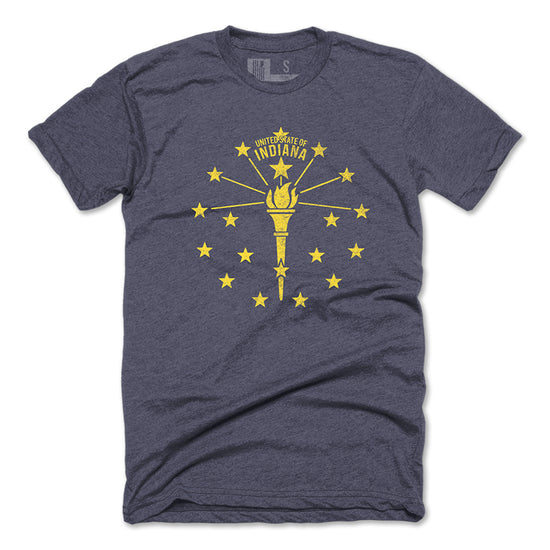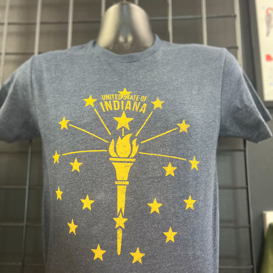 Indiana's state flag was designed by Paul Hadley of Mooresville, Indiana in 1917. The central torch represents liberty and enlightenment, surrounded by nineteen stars to mark Indiana's place as the nineteenth state in the union. Mr. Hadley was awarded $100 for his creation.