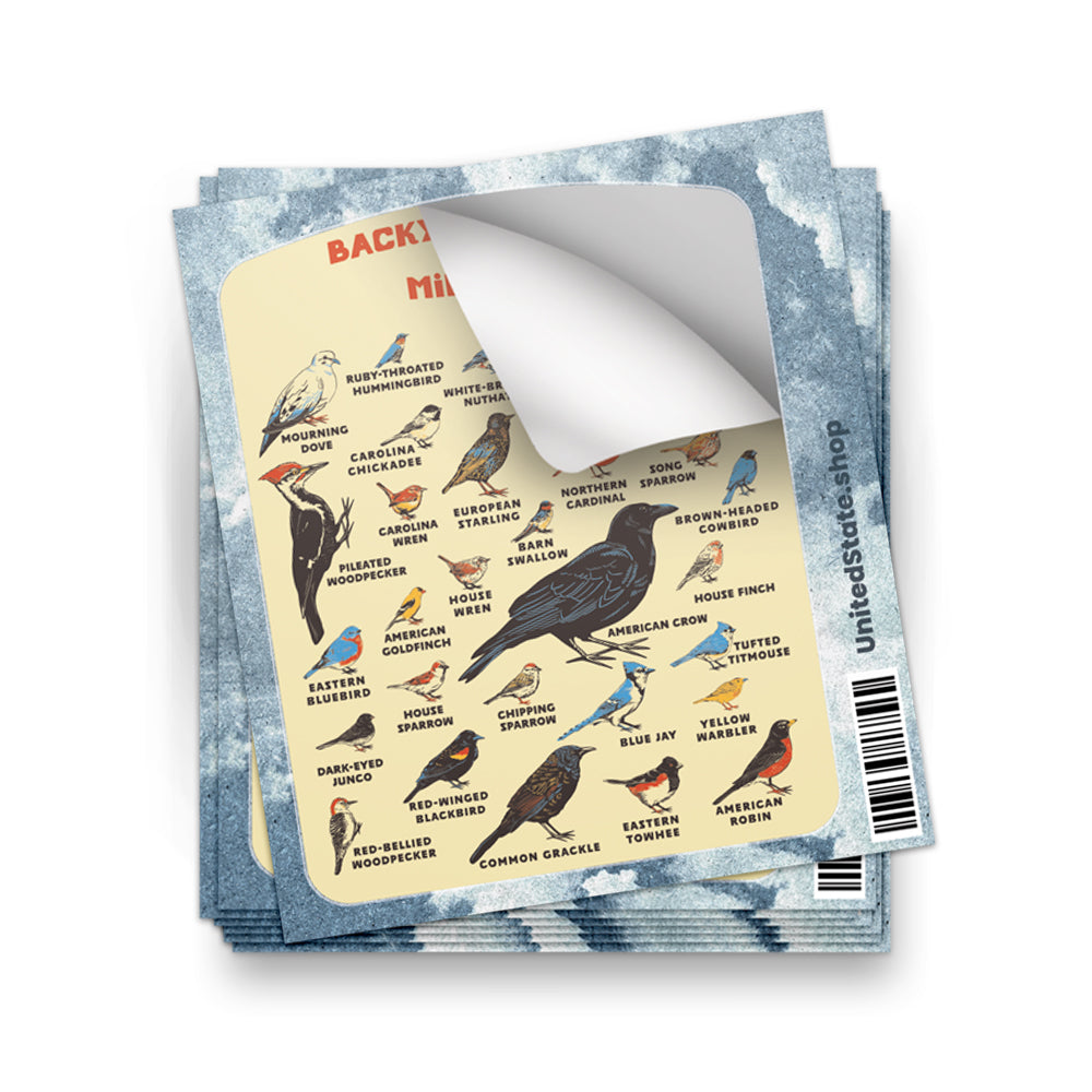 Featuring original illustrations of 30 different birds on a durable vinyl sticker, it's a perfect addition to your water bottle, journal or laptop.