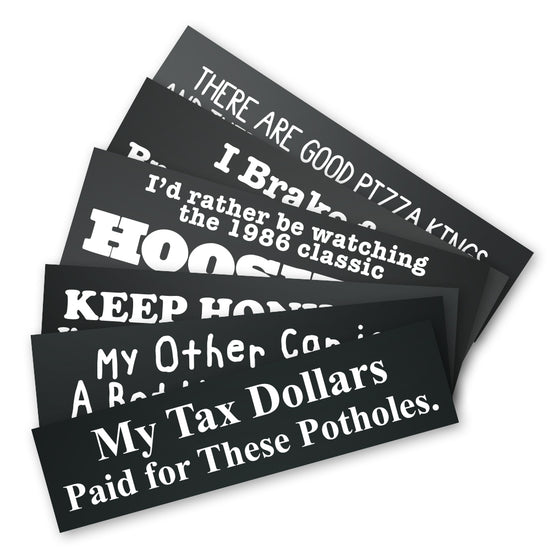 A deluxe set of wonderfully absurd bumper stickers for Hoosiers.