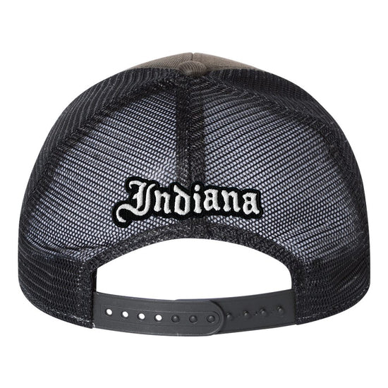 Our country skull on front and old english Indiana on back. Structured mesh back trucker with waxy finish on the cloth front for an all-weather, all-season style.