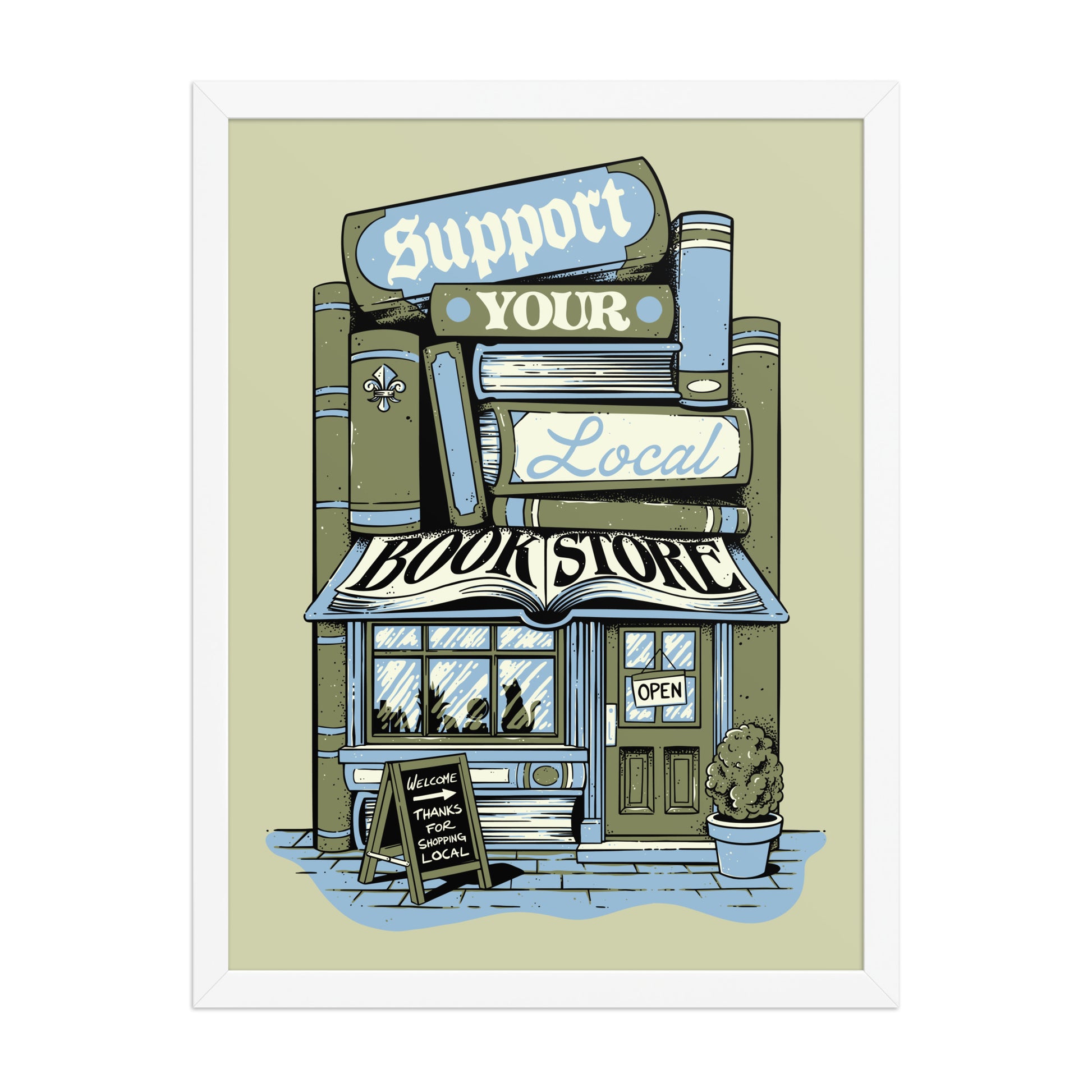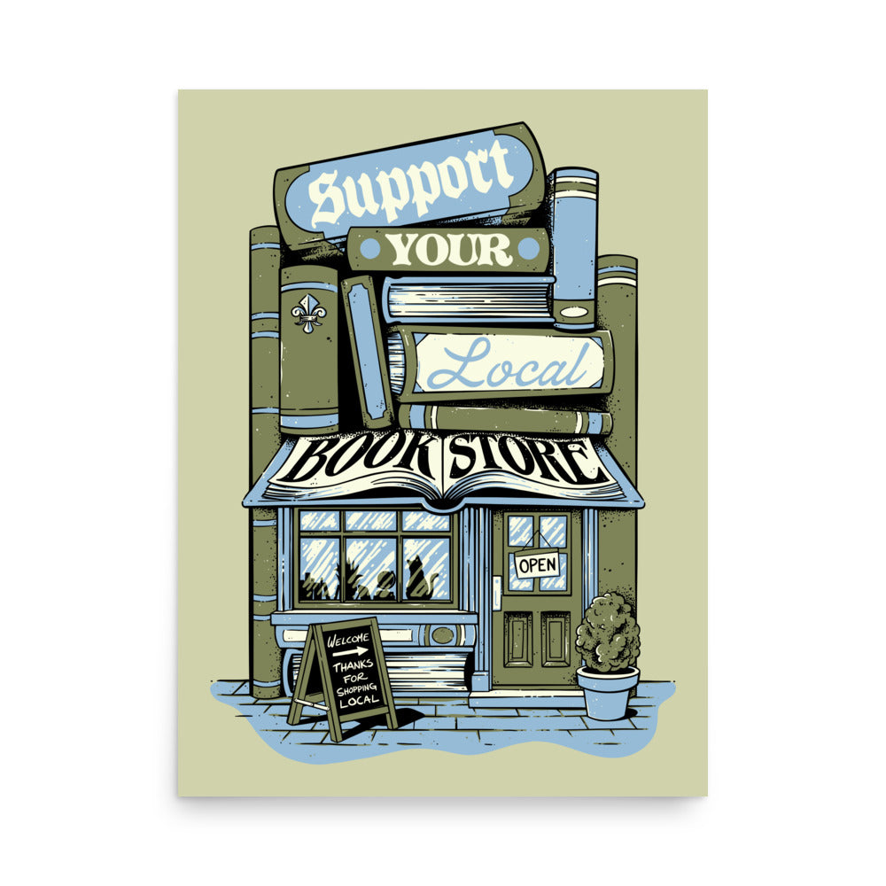 The Support Your Local Bookstore poster is a cozy call to action for readers who know that magic lives on neighborhood shelves.