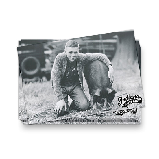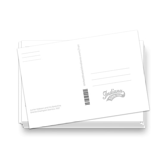 This postcard features a timeless shot of young Hoosier Junior Hobson with his Berkshire Grand Champion barrow at the 1937 Indiana State Fair.