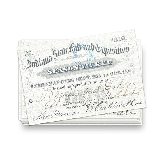 This postcard features an actual season ticket certificate from the 1876 Indiana State Fair.